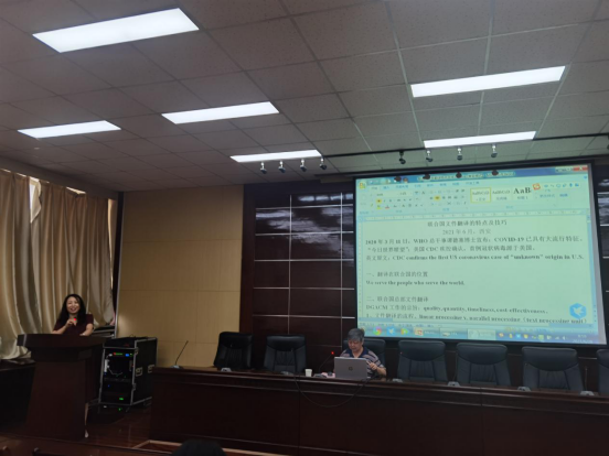 徐老师首先阐述了翻译作为幕后工作者在联合国不可或缺的作用,提出联合国文件翻译的宗旨是质量、产量、及时和效益,并以具体实例对联合国文件翻译的特点,如语种平等、敏感度高、时效性强、涉及范围广、新概念的翻译及历史记忆等逐一进行了阐释,最后向大家介绍了文件翻译应遵循的原则以及翻译技巧的运用。