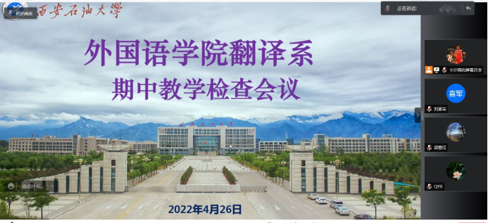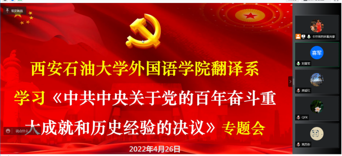 4月26日晚,威廉希尔williamhill中文翻译系通过腾讯会议召开政治理论专题研讨会暨期中教学检查会议。翻译系全体教师参加会议,会议由翻译系主任、党支部书记高鹏鹏主持。