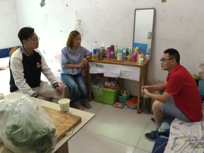 蒋老师与两位同学的家人进行了沟通和交流,向家长汇报了员工的在校表现,了解了两位同学的家庭情况,分发和宣传了建档立卡员工的国家政策,并代表学院为每位同学带去200元的慰问金。