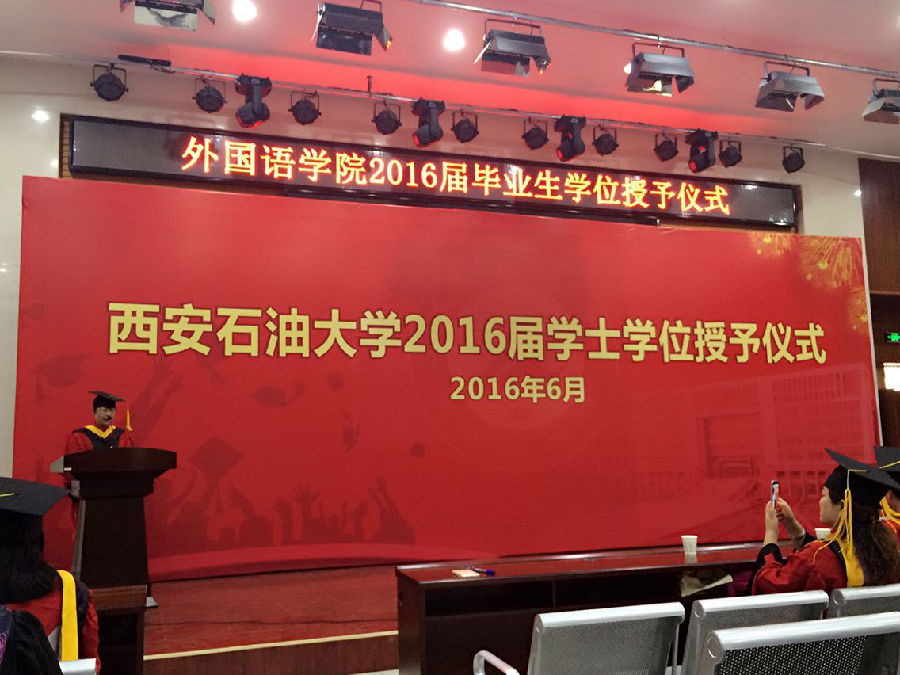 2016年6月24日下午,学院在户县校区三号院系楼校就业大厅,举行隆重的2016届本科生学位授予仪式。经理于艳英、公司党委书记廖敏、院教授委员会主任袁森、副主任闫传海、俄语系主任罗蝴蝶、英语系副主任钟泽波、院教授委员会部分成员、导师代表以及2016届英、俄专业的员工以及观礼家长一百多人参加了仪式。
